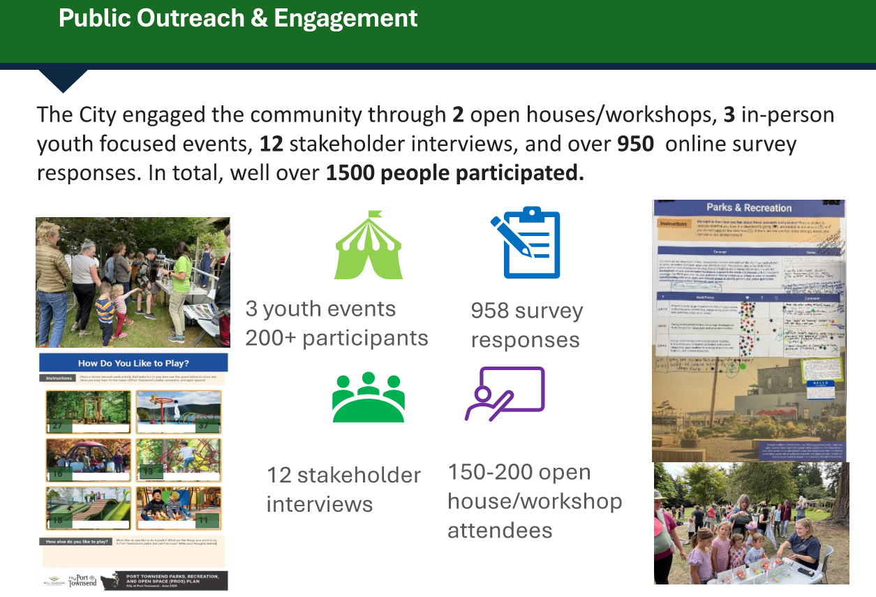 On July 20, August 17, and September 21, 2024, staff and Council Members hosted a table at the Port Townsend location of the Jefferson County Farmers Market. The table hosted conversations and information about the comprehensive plan and other city projects.